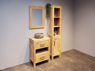 Het teak badmeubel is uitgevoerd met twee laden en een open midden stuk. Het bovenblad is niet van gaten voorzien, zodat u dit zelf kunt indelen. De teakhouten badkamerkast heeft 3 open vakken en 2 vakken achter het deurtje. De waskom is gemaakt van natuursteen. De spiegel is uitgevoerd met een extra stevige rand van 9cm breed en 3cm dik.