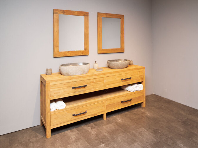 Het teakhouten badmeubel is uitgevoerd met vier laden en een open midden stuk. Het bovenblad is niet van gaten voorzien, zodat u dit zelf in kunt delen. De waskom is gemaakt van natuursteen. De spiegel is uitgevoerd met een extra stevige rand van 12cm breed en 3cm dik.