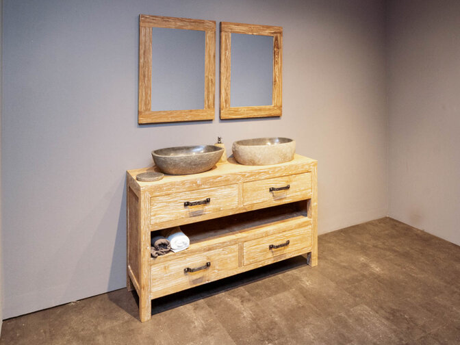 Het badmeubel is uitgevoerd met vier laden en een open midden stuk. Het bovenblad is niet van gaten voorzien, zodat u dit zelf in kunt delen. De badkamerkast heeft 3 open vakken en 2 vakken achter het deurtje. De waskom is gemaakt van natuursteen. De spiegel is uitgevoerd met een extra stevige rand van 12cm breed en 3cm dik. Een teakhouten badkamermeubel met white wash combineert duurzame warmte met een frisse, lichte look voor een ruimtelijke en elegante badkamer.