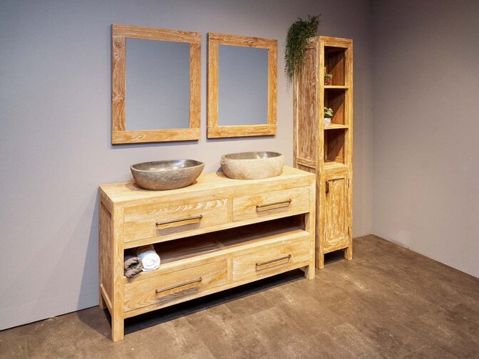 Het teak badmeubel is uitgevoerd met twee laden en een open midden stuk. Het bovenblad is niet van gaten voorzien, zodat u dit zelf kunt indelen. De waskom is gemaakt van natuursteen. De spiegel is uitgevoerd met een extra stevige rand van 9cm breed en 3cm dik. Een teakhouten badkamermeubelset in white wash combineert het beste van twee werelden: de natuurlijke warmte van teak en de frisse, lichte uitstraling van de white wash afwerking.