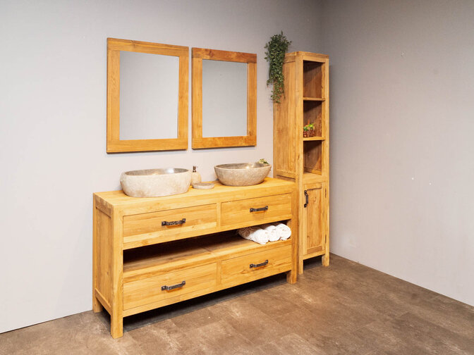 Dit mooie gerecyclede teakhout zal je overtuigen! Versier je badkamer met dit stijlvolle en praktische meubel met veel opbergmogelijkheden. Het komt goed tot zijn recht met een van onze waskommen.