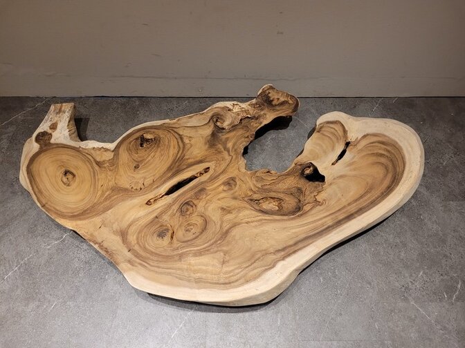 De boomstamtafel is gemaakt van een massieve boomstam van de Suar. Suarhout boomstamtafelblad is een prachtig natuurproduct. Het is warm gekleurd hout met mooie tekeningen. Dit relatief snelgroeiende hardhout kenmerkt zich door zijn compacte nerf en prachtige kleurschakeringen. Elke boom en daarmee elke tafel is anders en dus uniek, haal de natuur in huis!