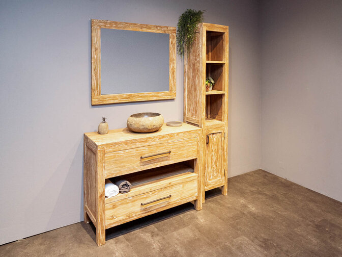 Het badmeubel 110cm is uitgevoerd met twee laden en een open midden stuk. Het bovenblad is niet van gaten voorzien, zodat u dit zelf kunt indelen. De waskom is gemaakt van natuursteen. De spiegel is uitgevoerd met een extra stevige rand van 9cm breed en 3cm dik. Een badkamermeubelset van teakhout met een white wash afwerking biedt het perfecte samenspel van natuurlijke warmte en frisse elegantie. Teak staat bekend om zijn robuustheid en uitstekende waterbestendigheid, wat het uitermate geschikt maakt voor vochtige omgevingen zoals de badkamer. Dankzij de white wash afwerking krijgt het meubel een lichte, verfijnde uitstraling, die bijdraagt aan een ruimtelijk en helder gevoel in de badkamer.