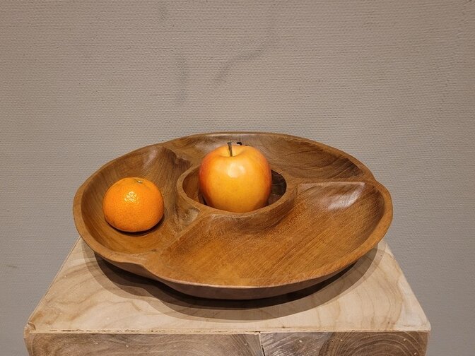 Deze natuurlijke teakhouten schaal van 40/50cm heeft mooie vormen en is gemaakt van de wortels van de teakboom. De natuurlijke houtpatronen zijn goed terug te zien wat de teak houten kom een ware eyecatcher maakt in elk huis! Elke fruitschaal is anders. Teak kommen en schalen zorgen voor afwisseling in saaie woonkamerhoek of als decoratie op tafel. Of het nu als decoratief object is, of als fruitschaal in de keuken, een fruitschaal of wortelhouten schaal van het fijne teakhout is geschikt voor bijna alle doeleinden.