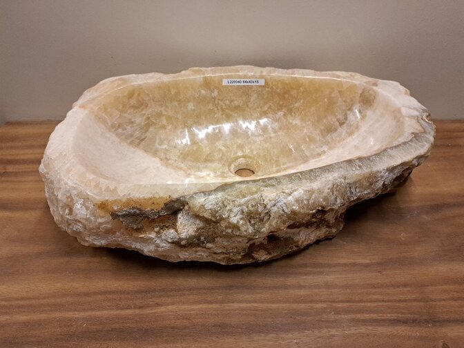 Elke Onyx waskom heeft zijn eigen uitstraling en karakter door een uniek gevormde structuur, kleur en afmeting. De binnenkant is glad gepolijst.