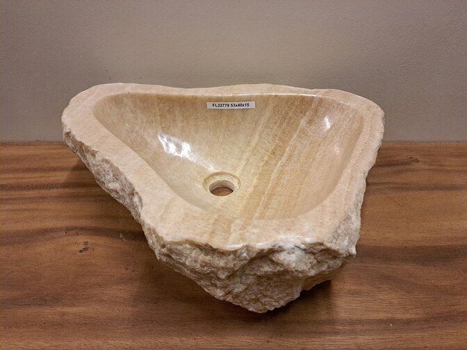 Elke Onyx waskom heeft zijn eigen uitstraling en karakter door een uniek gevormde structuur, kleur en afmeting. De binnenkant is glad gepolijst.
