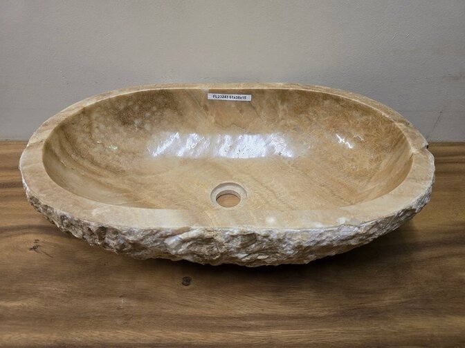 Elke Onyx waskom heeft zijn eigen uitstraling en karakter door een uniek gevormde structuur, kleur en afmeting. De binnenkant is glad gepolijst.