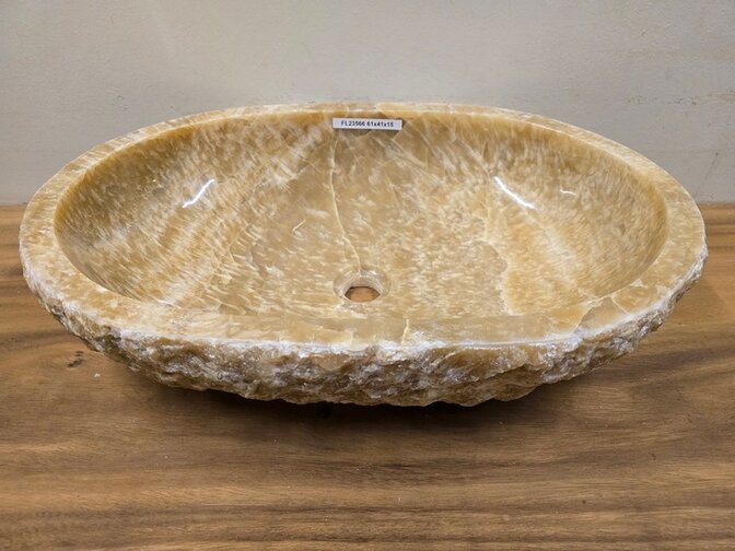 Elke Onyx waskom heeft zijn eigen uitstraling en karakter door een uniek gevormde structuur, kleur en afmeting. De binnenkant is glad gepolijst.