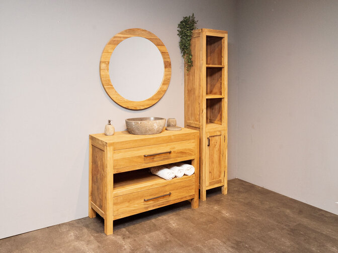 Het badmeubel is uitgevoerd met twee laden en een open midden stuk. Het bovenblad is niet van gaten voorzien, zodat u dit zelf kunt indelen. De badkamerkast heeft 3 open vakken en 2 vakken achter het deurtje. De waskom is gemaakt van natuursteen. De spiegel is uitgevoerd met een extra stevige rand van 9cm breed en 3cm dik.