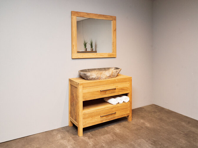 Het badmeubel is uitgevoerd met twee laden en een open midden stuk. Het bovenblad is niet van gaten voorzien, zodat u dit zelf kunt indelen. De waskom is gemaakt van natuursteen. De teak houten spiegel is uitgevoerd met een extra stevige rand van 9cm breed en 3cm dik.