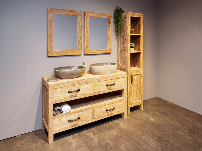 Het badmeubel is uitgevoerd met vier laden en een open midden stuk. Het bovenblad is niet van gaten voorzien, zodat u dit zelf in kunt delen. De badkamerkast heeft 3 open vakken en 2 vakken achter het deurtje. De waskom is gemaakt van natuursteen. De spiegel is uitgevoerd met een extra stevige rand van 9cm breed en 3cm dik. Een teakhouten badkamermeubel met white wash combineert duurzame warmte met een frisse, lichte look voor een ruimtelijke en elegante badkamer.