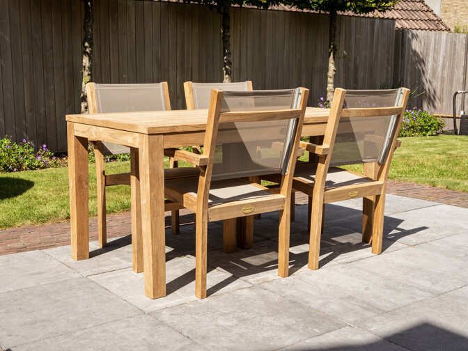 De teakhouten tuinmeubelen worden gemaakt van A-kwaliteit teakhout en hoeft niet behandeld te worden. Na verloop van tijd zal het tuinset gaan vergrijzen naar een zilver grijze kleur. Wilt u het tuinset op kleur houden kunt u het behandelen met onze Golden Care producten.
