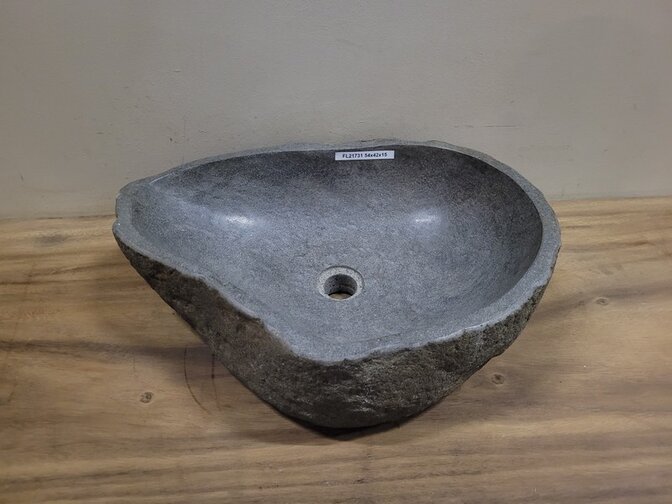 Al onze waskommen van natuursteen worden gemaakt van rivierstenen uit Indonesië, deze bestaan uit een soort graniet of basalt. Door de buitenkant onbewerkt te laten is iedere waskom uniek.